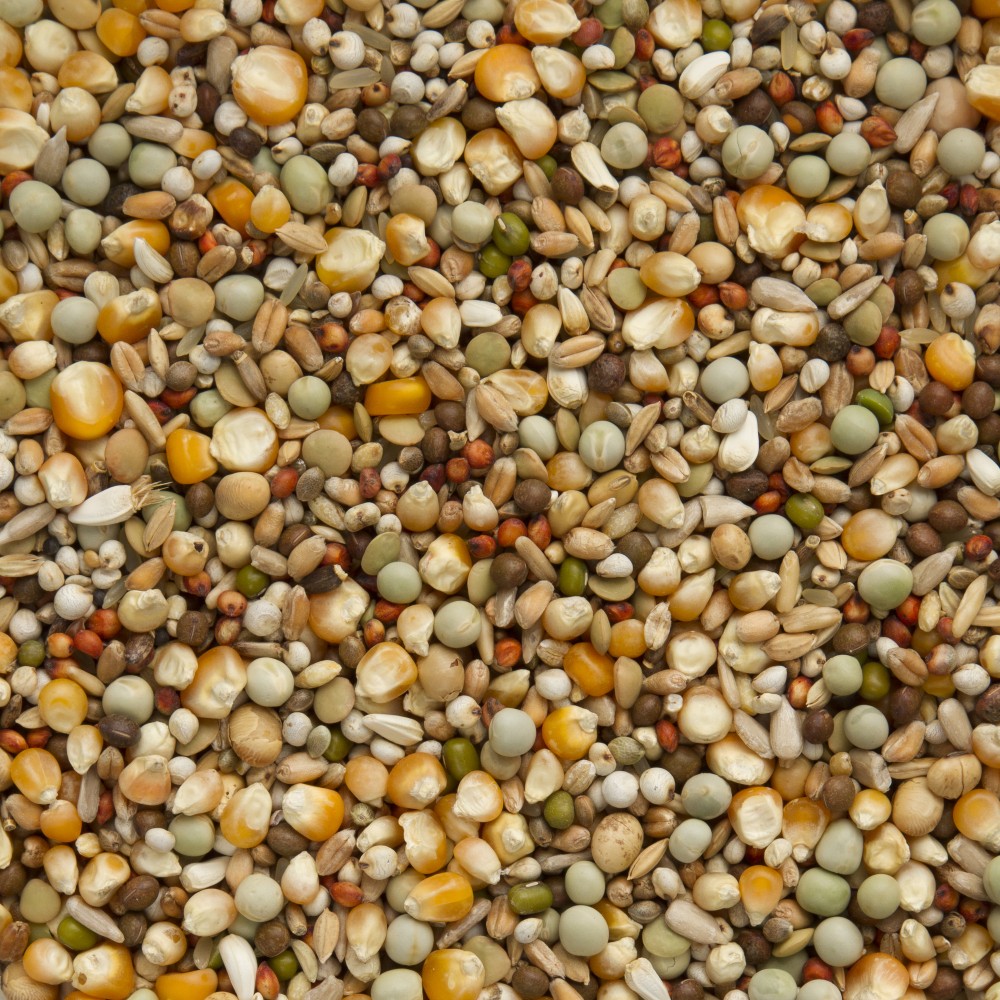 Kleine cribbs maïs 10%, kleine groene erwten 10%, popcornmaïs 8%, tarwe 8%, dari wit 8%, extra rode sorgho 6%, kempzaad 6%, vitsen/wikken 4%, linzen 4%, getoaste sojabonen 4%, duivenrijst 4%, paddy rijst 2%, gepelde haver 2%, gepelde gerst 2%, katjang idjoe 2%, koolzaad 2%, raapzaad 2%, gele millet 2%, witte millet 2%, sesamzaad 2%, lijnzaad 2%, mariëndistel 2%, gepelde zonnebloempitten 2%, cardy 2%, kanariezaad 2%