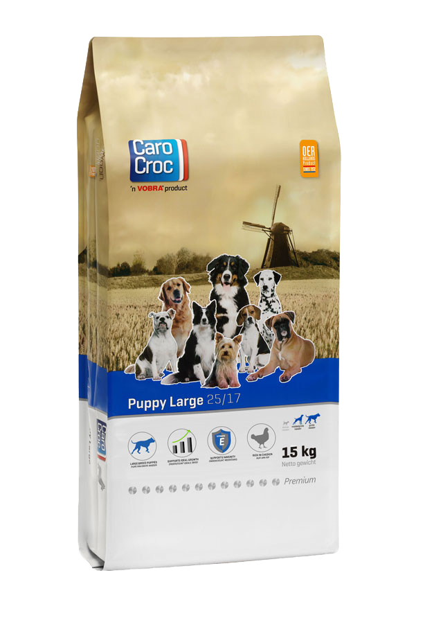 De pups van grote rassen moeten rustig groeien, groeien ze te snel dan kan dar gewrichtsproblemen geven. Daarom bevat CaroCroc Puppy Large een uitgebalancerd energie- en eiwitgehalte. Daarnaast de juiste hoeveel calcium voor een gelijkmatige groei.
