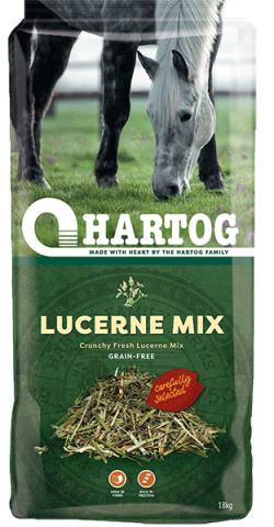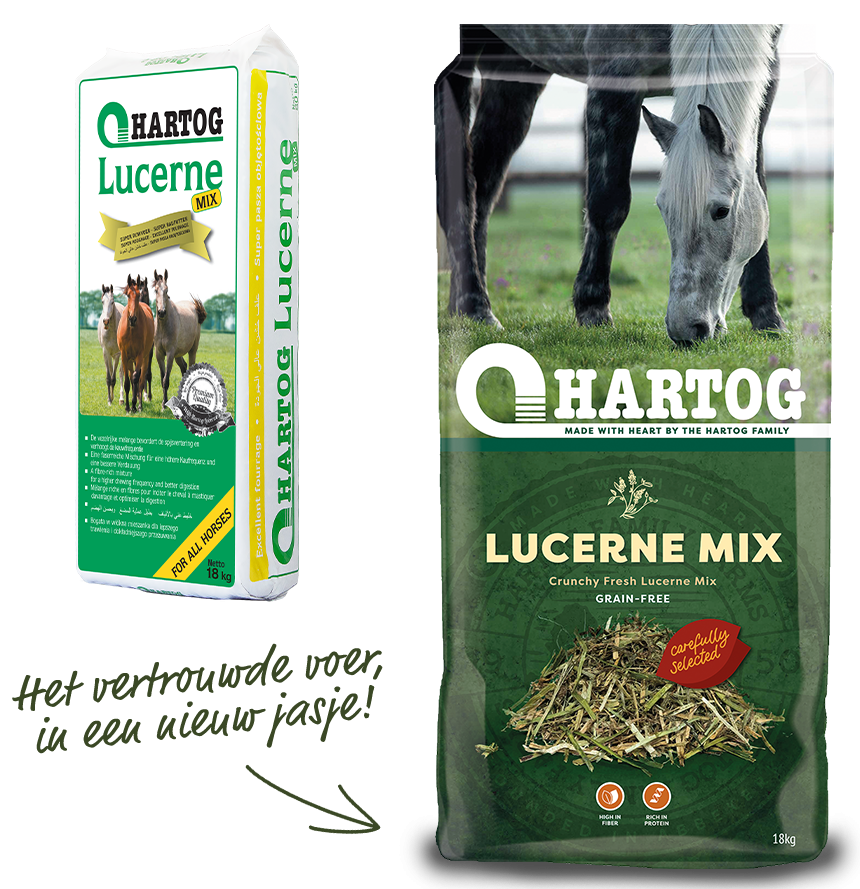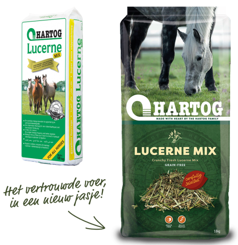 De Lucerne-mix wordt geproduceerd door vers gehakselde luzerne te vermengen met groen geoogste snijhaver. Deze combinatie staat garant voor langzaam vrijkomende energie ter ondersteuning van het uithoudingsvermogen, zonder dat het paard heet of nerveus wordt. Het suiker- en zetmeelgehalte in Lucerne-mix is uitermate laag waardoor de ruwvoermix geschikt is voor alle paarden of pony’s. Het eiwitgehalte is gereduceerd door de toevoeging van groengeoogste snijhaver. De toevoeging van plantaardige olie met melasse zorgt voor extra smakelijkheid en een glanzende vacht.