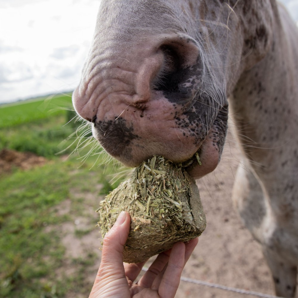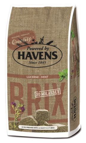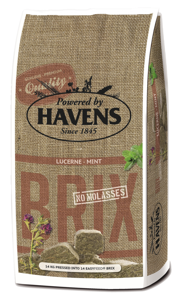 Havens Brix – luzerne & mint blokken bestaan uit hard geperste blokken van luzerne en mint, ideaal als beloning én om het rantsoen van het paard op te waarderen.
