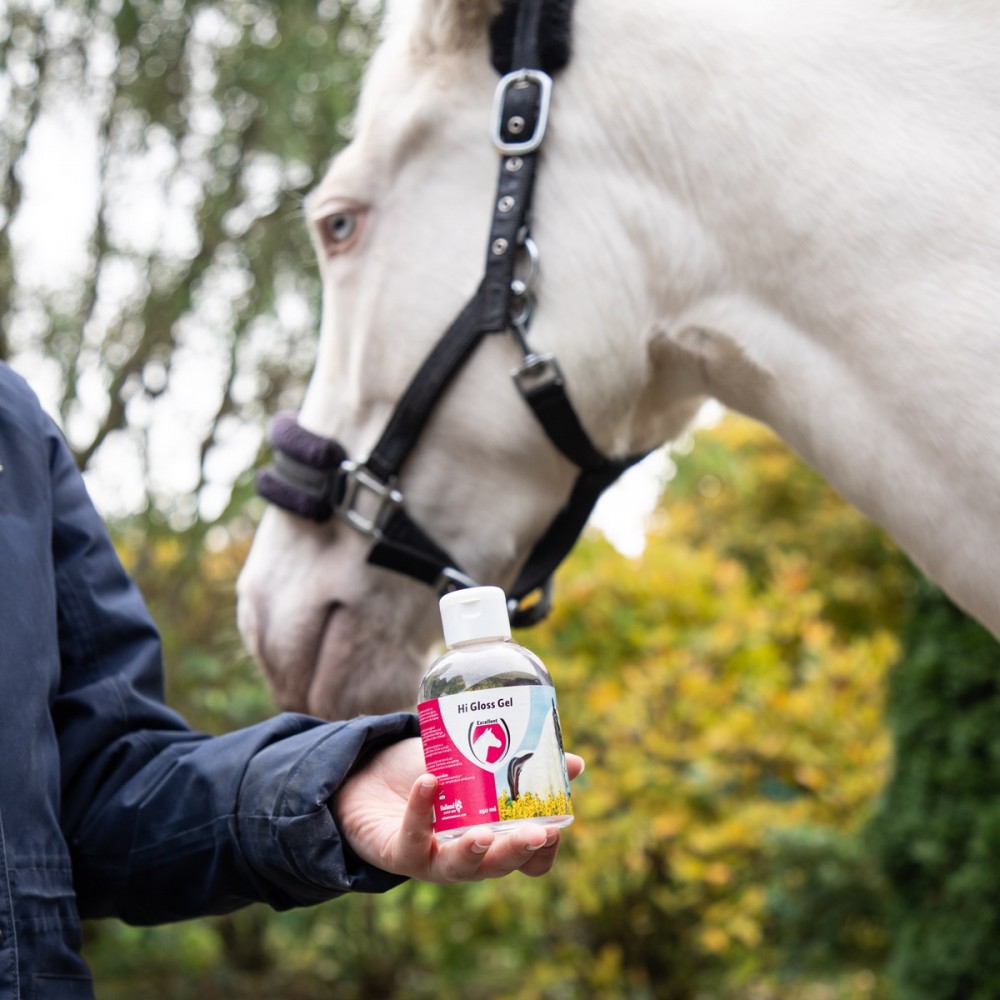 Hi Gloss Gel voor paarden droogt snel, ontklit super, is perfect doorkambaar, geeft een prachtig volume, geeft een shiny glans, blijft vuilafstotend, is niet vet en is door de micro W/O (water-olie) emulsie en de faire prijs zéér voordelig in gebruik.