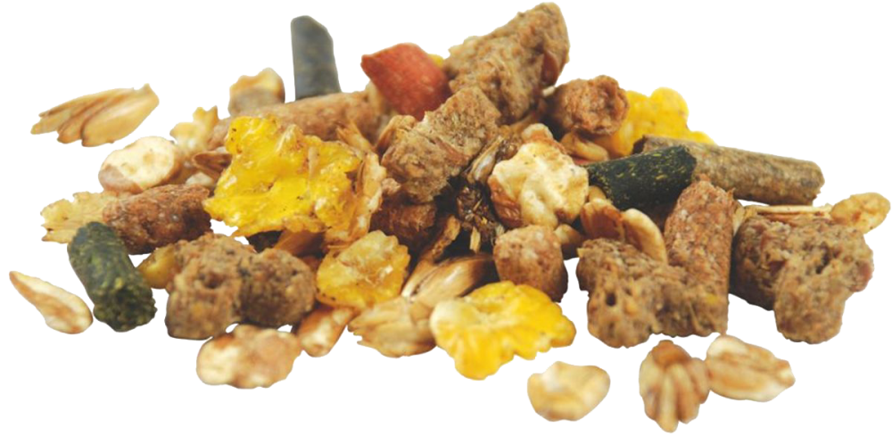 Gerstvlokken, Haverzemelen, Zonnebloemzaadschroot, Maïsvlokken, Luzerne, Lijnzaad, Tarwe, Tarwegries, Lijnzaadolie, Tarwe geëxpandeerd, Rietmelasse, Cichoreipulp, Calciumcarbonaat, Cichoreiwortel, Zonnebloemzaadschillen, Gerst, Natriumchloride, Monocalciumfosfaat, Magnesiumoxide, Appelpulp, Gistcultuur, Inuline, Aardappelzetmeel.