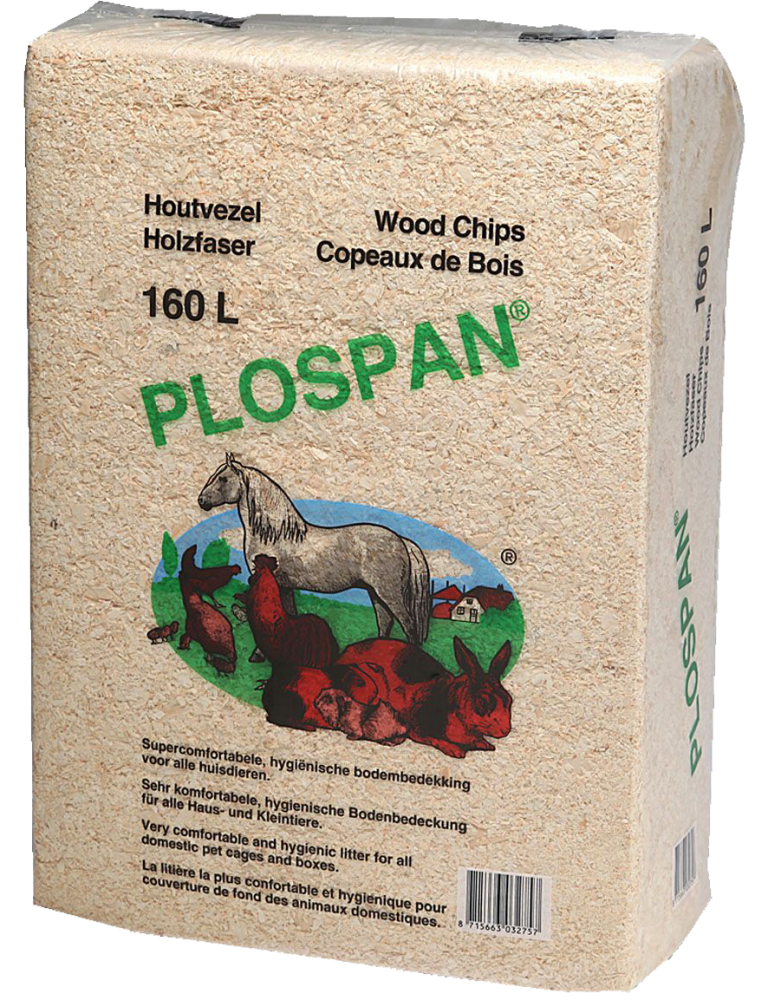 Plospan houtvezel is verkrijgbaar in klein- en grootverpakking. De grootverpakking is het ideale strooisel voor in uw paardenstal en de kleinverpakking is bijzonder geschikt voor knaagdieren zoals konijn, cavia, hamster, rat, muis, degoe of chinchilla.
