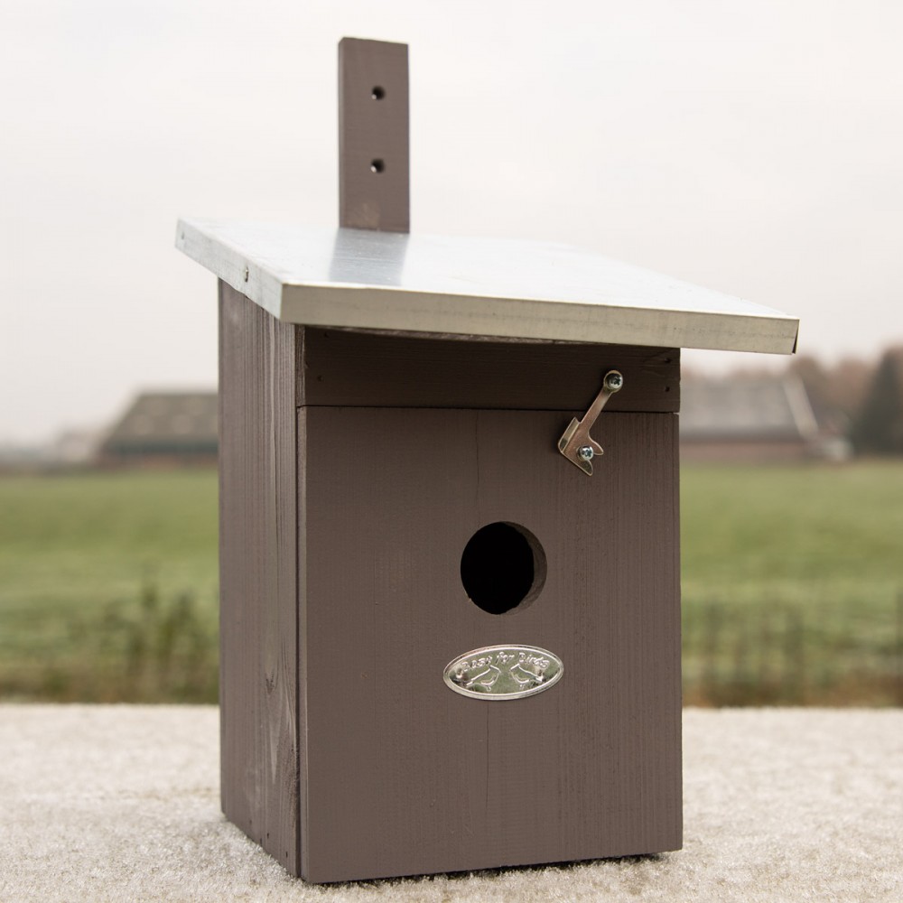 De nestkast is aan de voorkant te openen om schoon te maken.