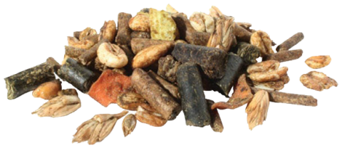Sojaschillen, sojaschroot, getoast, spelt, luzerne, tarwegries, gepofte gerst, havergries, gepofte, tarwe, raapzaadschroot, sojaolie, rietmelasse, lijnzaad, tarwe, gerst, appel pulp, maïs, erwtenvlokken, zonnebloemzaadschroot, wortelvlokken, cichoreipulp, biergist, vitaminen - mineralen