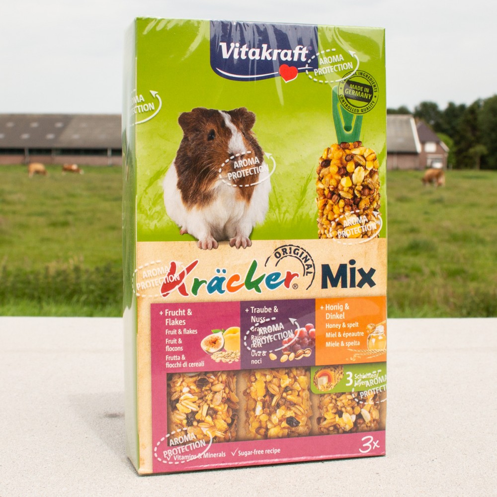 De Vitakraft Kräcker Mix voor cavia's is een gezonde lekkernij, 3 verschillende smaken Kräckers in de mix met lekkere honing & spelt, noten & druiven en fruit & flakes op een natuurlijk knabbelhoutje.