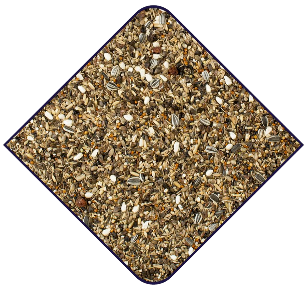 Nigerzaad, kanariezaad, graszaad, Japans millet, lijnzaad, geel Panicum, marien distelzaad (5%), gepelde haver, wortelzaad, klaverzaad, rood Panicum, chicoreizaad, bruine perilla zaad, raapzaad, wit perilla zaad, zwart slazaad, wit slazaad, selderijzaad, sesamzaad, blauwmaanzaad, hennepzaad, gepelde zonnebloempitten, rode millet, teunisbloemzaad