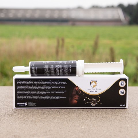 Hoefverzorgingspasta op basis van zinkoxide - koper- en zinkchelaat in combinatie met organische zuren en tea tree olie.